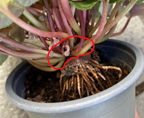 球根部分に土がかかっているのは問題ありませんが、芽が出てくる根元部分(画像の赤い丸部分)に土がかかっている場合は、土をよけて植え付けてください。鉢増しや、植え替えをしていただく場合にも、球根トップには土をかけす、根を傷めないように根を崩さず、すっぽりと一、二回り大きい鉢に植え替えてください。(ただし、耐乾性シクラメン エリシオン・アヴァロンについては球根の頭が少し隠れるぐらいで植えてください。)