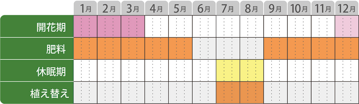 ※関東地方以西低地基準になります。地域やその年の気候、生育状態により、開花期やお手入れの適期などは変わります。栽培カレンダーは目安としてください。