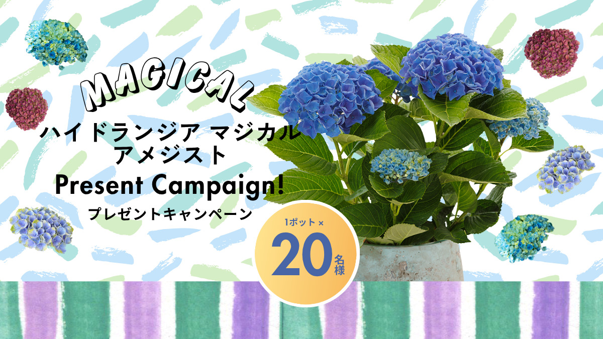 ハイドランジア マジカル アメジスト プレゼントキャンペーン ハクサンコレクションからハイドランジア マジカル アメジストを20名様にプレゼントいたします!マジカルアメジストは 花弁が強く長持ちするので、2~3か月花色の変化を楽しんでいただけます。秋まで続く色彩の変化を楽しんで、マジカルシンフォニーをあなたの庭で奏でましょう。 POINT 色の移り変わりを楽しむハイドランジアです 花弁が強い長もちタイプです ヴィンテージカラーの秋色あじさいを楽しめます 3~6カ月花色変化を楽しめます プレゼント賞品 ハイドランジア マジカル アメジスト20名様にプレゼント! 応募期間 4月10日(金)~4月20日(月)まで 応募はこちら 応募はこちら