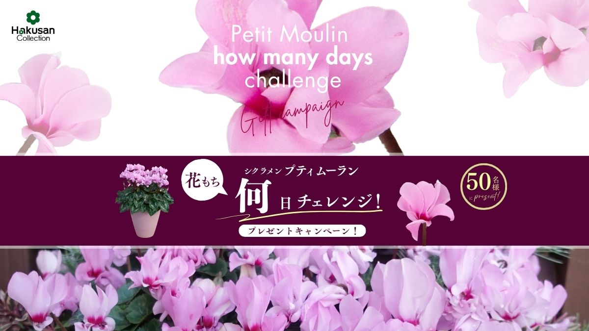 シクラメン プティムーラン 花もち何日チャレンジキャンペーン シクラメン プティムーランは、蝶々のようなカールしたかわいい八重咲きのミニシクラメンです。花持ちがとってもよく・連続開花性に優れ、長く花を楽しむことができます。その花もちの良さは約100日ともいわれています。こんなに花もちのいいシクラメンプティムーランを抽選で50名様にプレゼントいたします!是非、何日お花が持つか観察しながらお楽しみください! POINT 八重咲きシクラメンです 花持ちがよく長く楽しめます 花茎が放射状に立ち上がり、自然なシルエットも特長的です ナチュラルでやわらかな雰囲気です プレゼント賞品 プティムーラン 1ポット(色はお楽しみ!)50名様にプレゼント! 応募期間 10月31日(金)~11月16日(日)まで 応募はこちら 応募はこちらから