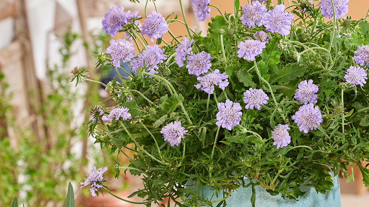 スカビオサ アメジスト ピンクは、花径6cm程度の大輪の花を咲かせます。藤色と桃色の中間色とも言えるような淡い花色は、他になく注目を集めている品種です。