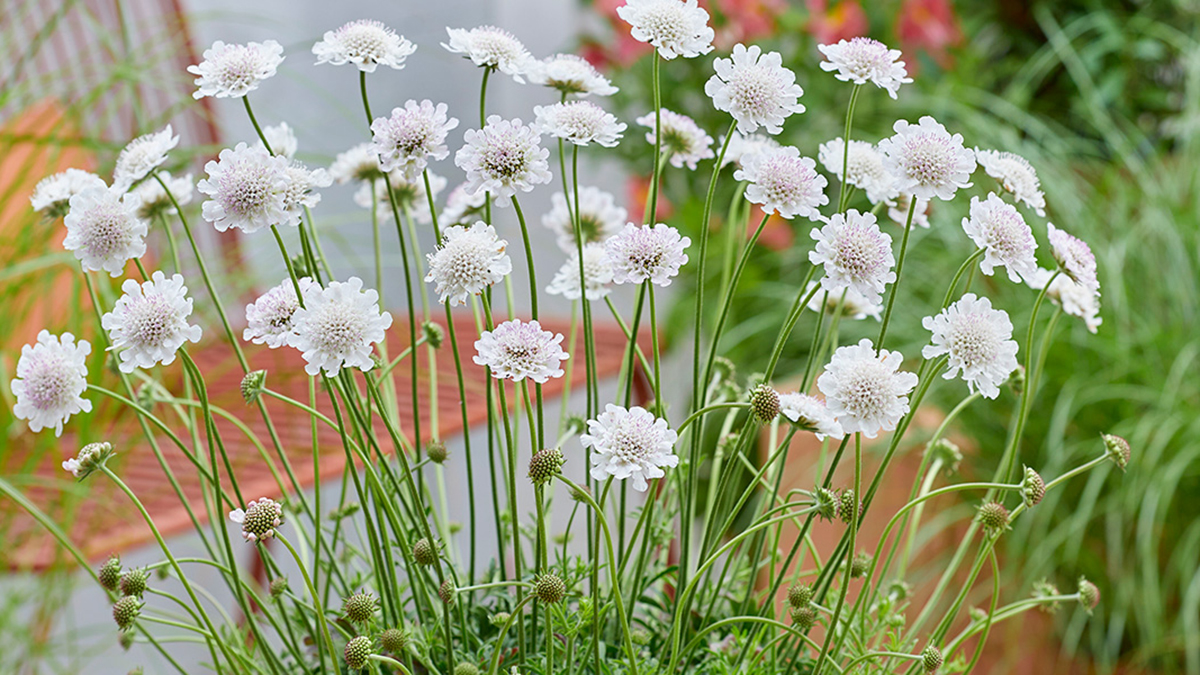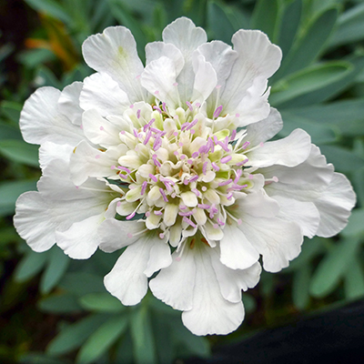 スカビオサ アメジスト スノーは、花径6cm程度の大輪の花を咲かせます。中心が薄ピンクに色づく可愛らしい四季咲き性の品種です。